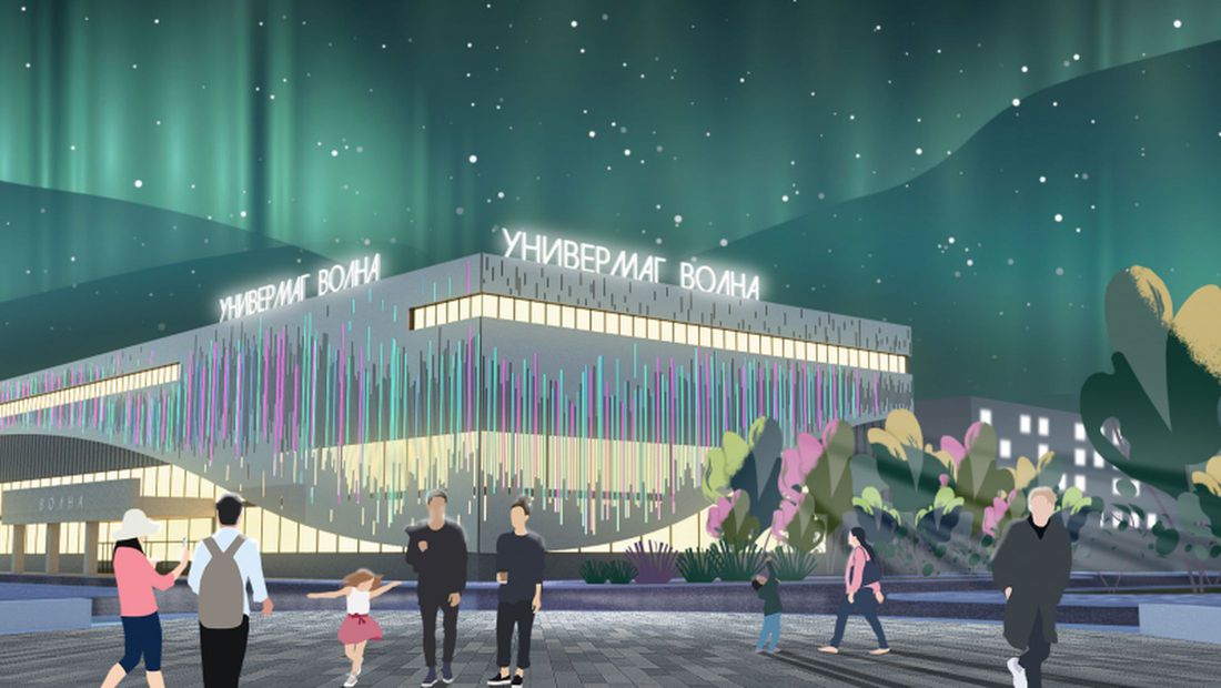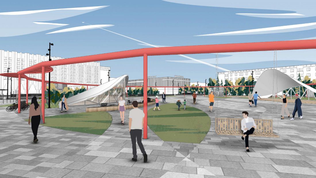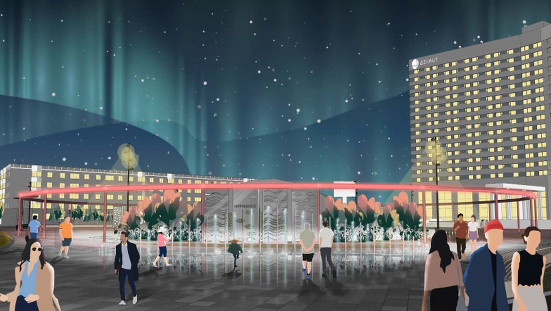 Доминанта проекта – красная круглая конструкция, призванная стать символом Мурманска. Подсветка «кольца» сделает его точкой притяжения жителей в условиях продолжительной полярной ночи. Внимание уделяется озеленению, защите от непогоды, удобству использования пространства пожилыми и маломобильными людьми.